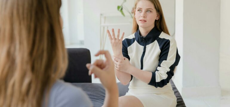 Eine Frau zeigt ihre ausgestreckte Handfläche nach vorne.