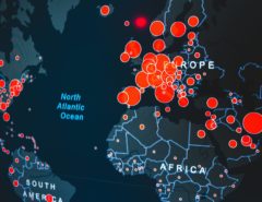 • Weltkarte der Corona Hotspots mit roten Kreisen markiert