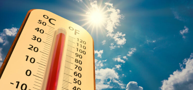Ein Thermometer zeigt eine hohe Temperatur an, im Hintergrund scheint die Sonne.