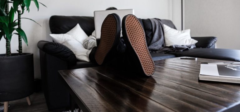 Ein Mann mit ausgestreckten Beinen arbeitet vom Wohnzimmertisch.