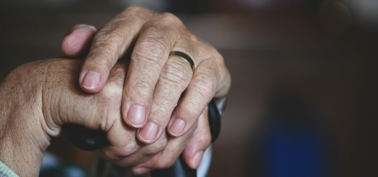 Die geballte Faust eines Mannes im Vordergrund, im Hintergrund eine Frau, die beim Tisch sitzt.