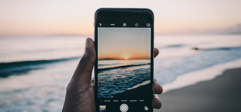 Eine Person hält ein Smartphone und fotografiert das Meer.