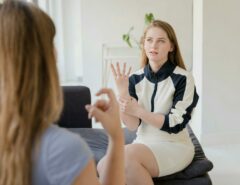 • Zwei Frauen unterhalten sich in der Gebärdensprache miteinander.