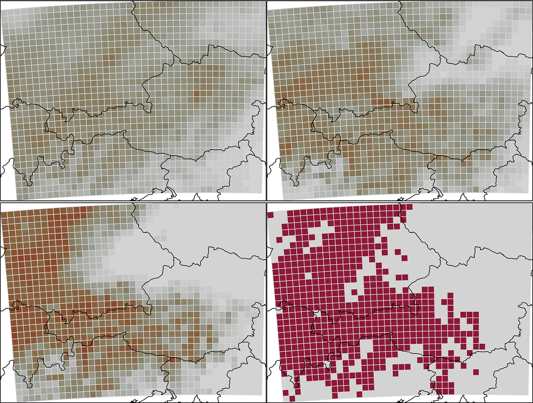 Um den möglichen Auftrittsort für ein Gewitter zu errechnen, legt Simon ein Gitter über die Österreichkarte. Jede Masche des Gitters grenzt ein quadratisches Gebiet mit einer Seitenlänge von 16 Kilometern ein. Anhand der Wetterdaten kann pro Gebiet ermittelt werden, ob dort in den letzten sechs Stunden ein Gewitter passiert ist oder nicht.
