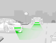 • Die Illustration zeigt drei Autos, zwei davon sind mit Vorderlichtern (hier grün markiert) ausgestattet.