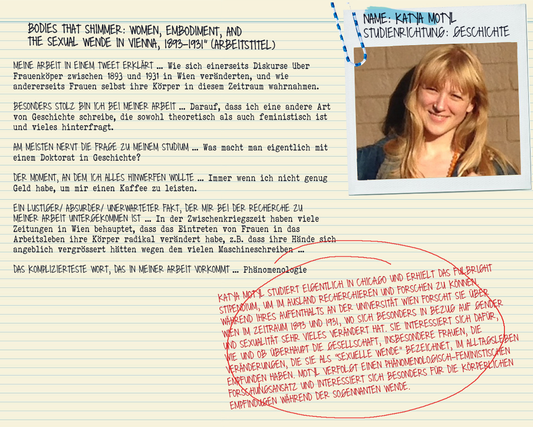 Für Katya Motyl ist Wien tatsächlich zu Chicago geworden. Zumindest was ihre aktuelle Heim-Uni anbelangt. Dass Motyl für ihre Dissertation nach Wien gekommen ist, hängt mit ihrem Forschungsthema zusammen. Dabei geht es nämlich um das Wien der Jahrhundertwende. Dieses Wiener Fin de Siècle ist momentan ja überall zu finden. Die Ringstraße wird historisch seziert und wissenschaftliche Entdeckungen der Zeit werden auf ihre Auswirkungen hin durchleuchtet. Katya Motyl geht es aber nicht um Architektur oder Chemie. Sie nimmt einen besonderen Aspekt des damaligen Wiener Alltags unter die Lupe.
