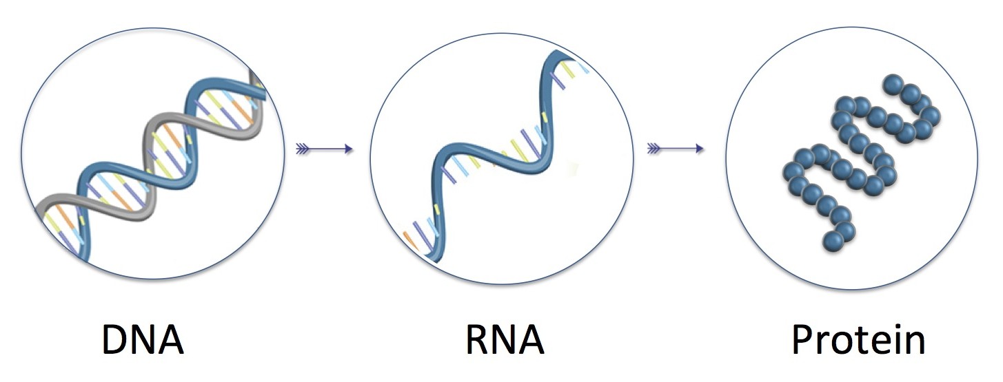 In der DNA ist eine Kopie der Erbinformation gespeichert, die als Bauplan für den lebenden Organismus dient. Bestimmte Abschnitte werden Gene genannt. Sie können abgelesen und bei Bedarf in RNA übersetzt werden. Auf deren Grundlage werden anschließend die Proteine zusammengebaut.
