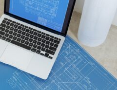 • Ein Laptop steht auf einem Bauplan. Daneben ist noch eine weiterer gedruckter Bauplan zu sehen.