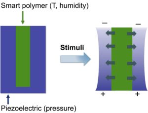 Bei der künstlichen Haut passiert das Gleiche, jedoch in einem viel kleineren Maßstab: Wird Druck auf die künstliche Haut ausgeübt, verformt sich diese und die Piezoschicht sendet ein elektrisches Signal aus. Das gleiche passiert dank des flüssigkeitsspeichernden Polymers bei Feuchtigkeits- und Temperaturschwankungen. Bei Kälte dehnt es sich aus, bei Wärme zieht es sich zusammen und übt so Druck auf die umgebende Piezo-Schicht aus.