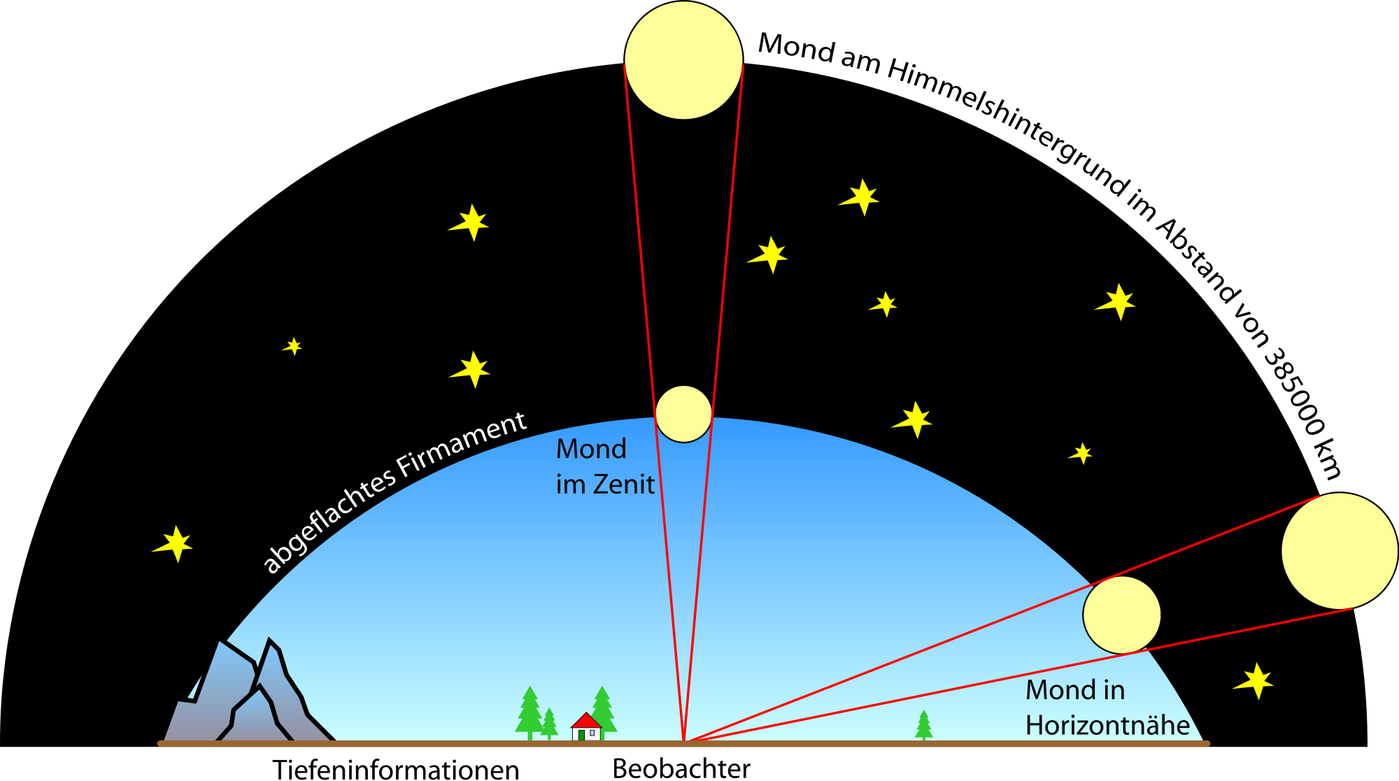 Ein Erklärungsansatz für dieses Phänomen findet sich in der Wahrnehmungspsychologie, wonach es sich um eine optische Täuschung des menschlichen Auges handeln soll: „Wir nehmen subjektiv den Himmel nicht als Halbkugel über uns wahr, sondern als abgeflachtes Gewölbe, dessen Rand am Horizont von uns scheinbar weiter entfernt liegt als die Punkte über uns“, erklärt Güdel. „Insbesondere die vielen Bezugspunkte erzeugen zwischen uns und dem Horizont auch den Eindruck einer Tiefenwirkung – also einer Distanz, die beim Blick nach oben fehlt.“ Das menschliche Auge nimmt den Blickwinkel am Horizont also größer wahr als den Blick nach oben, wodurch der Mond bei niedrigem Stand größer wirkt. Ähnlich verhält es sich auch mit der Sonne, wenn sie am Horizont unter- oder aufgeht.