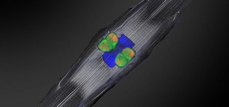 Die den Rhizobien-zugehörigen stickstofffixierenden Symbionten (mit fluoreszierenden Gensonden markiert in orange und grün) befinden sich innerhalb von Kieselalgen, die im tropischen Nordatlantik gesammelt wurden. Der Zellkern der Kieselalge ist in blau zu sehen.