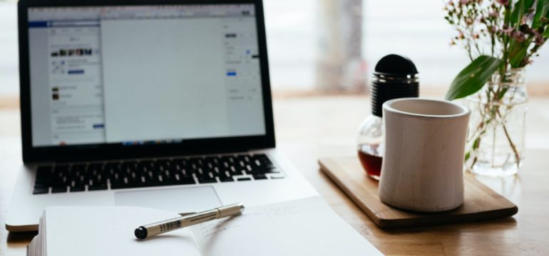 Offenes Notizbuch mit Stift liegt vor dem Laptop.