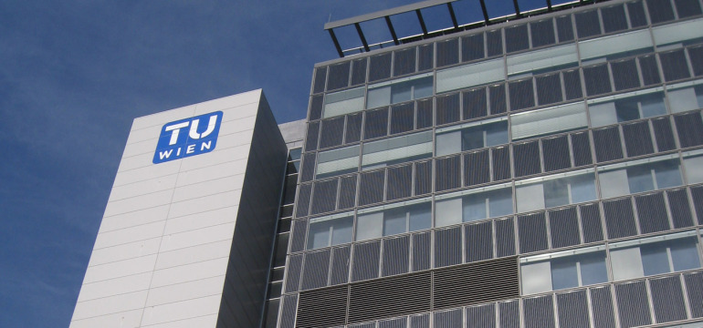 Eine in Form des TU Wien Logos mittels Inkjet gedruckte keramische Dünnschicht auf einem oxidischen Elektrolyt-Einkristall. Der Inkjet Druck ist eine der in diesem CD Labor untersuchten Methoden, um keramische Dünnschichten für Sauerstoffionenbatterien kostengünstig und skalierbar herstellen zu können.