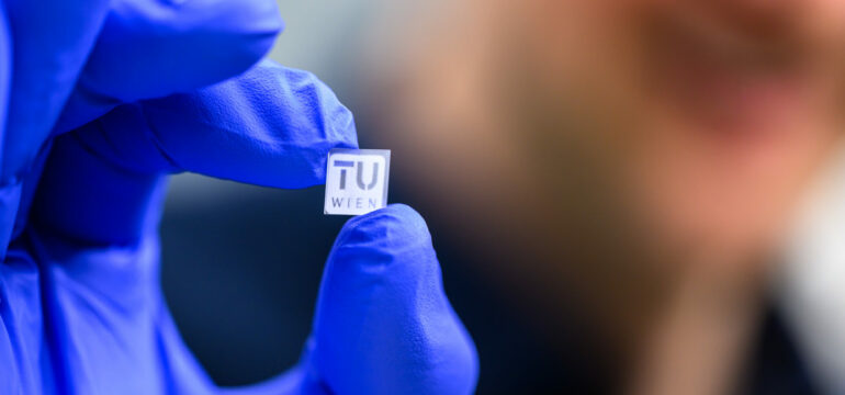 Eine in Form des TU Wien Logos mittels Inkjet gedruckte keramische Dünnschicht auf einem oxidischen Elektrolyt-Einkristall. Der Inkjet Druck ist eine der in diesem CD Labor untersuchten Methoden, um keramische Dünnschichten für Sauerstoffionenbatterien kostengünstig und skalierbar herstellen zu können.