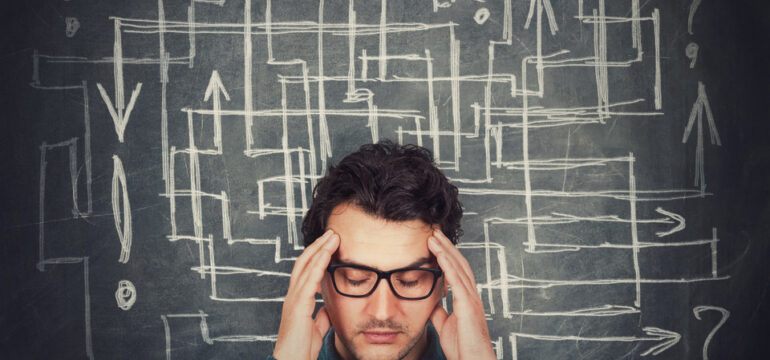 Ein Mann steht vor einer Tafel, er fasst sich mit beiden Händen an seine Schläfen. Auf der Tafel ist eine Zeichnung mit einigen Fragezeichen zu sehen.