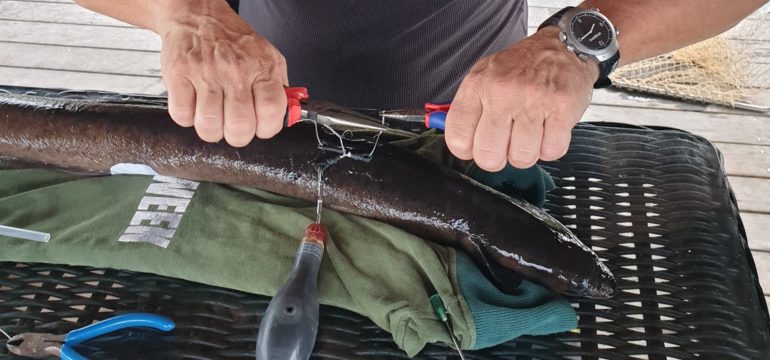 Robert Schabetsberger befestigt einen Satellitensender mit zwei Zangen an einem Aal.