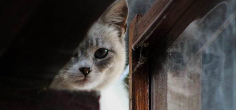 Eine Katze blickt durch an einem Fenster vorbei, in dessen Glas sie sich spiegelt.