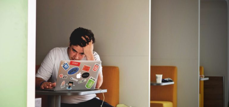 Eine Person mit kurzen Haaren sitzt in einem Café und blickt fokussiert auf einen Laptopbildschirm.