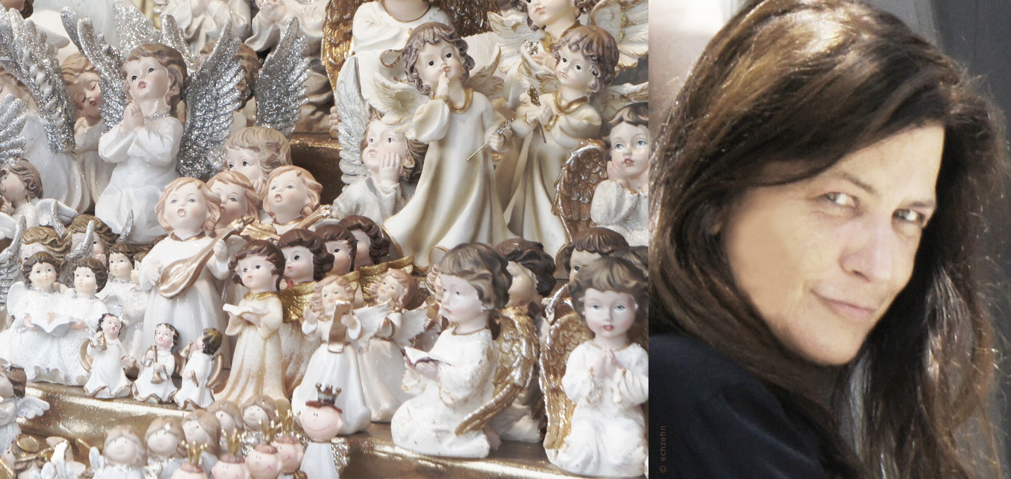 Elfie Miklautz neben einer Schar von Engeln, die geschenkt werden wollen