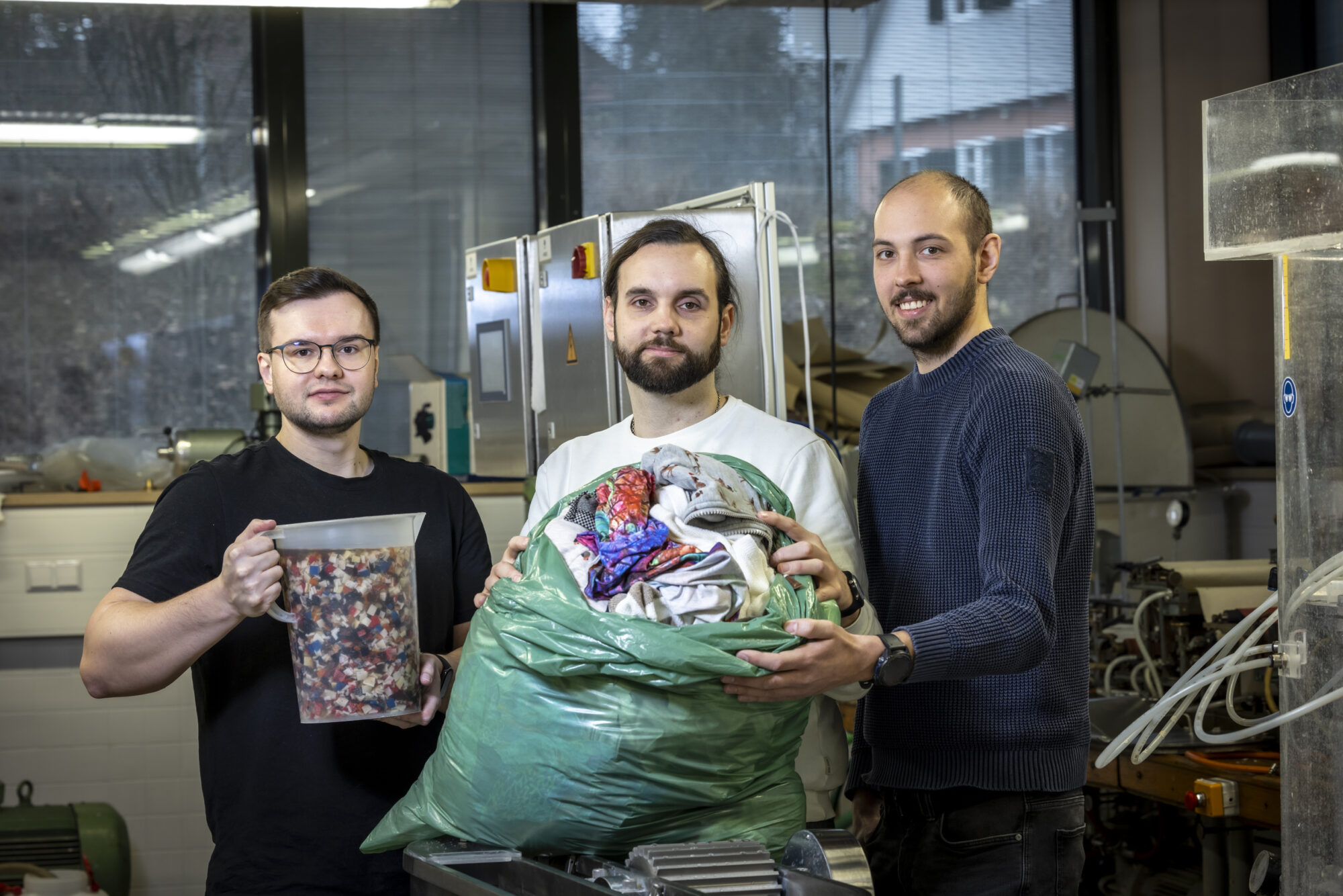 Alexander Weissensteiner, Thomas Harter, Alexander Wagner (v.l.) vom Institut für Biobasierte Produkte und Papiertechnik mit Altkleidern, aus denen sich Papier herstellen lässt.