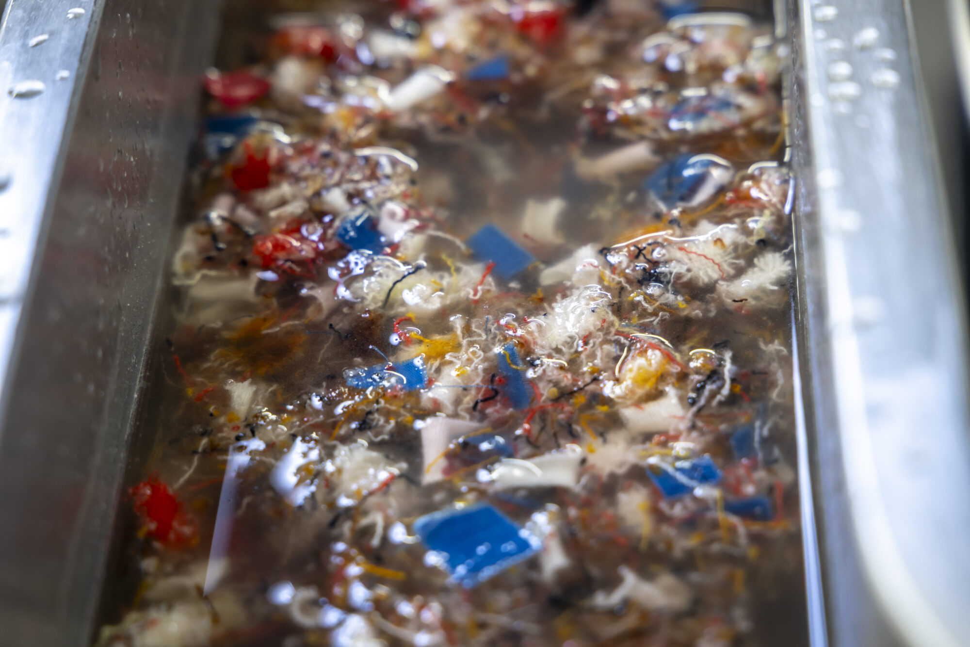 Um aus alten Kleidungsstücken Papier zu gewinnen, werden sie zunächst in kleine Fetzen geschnitten und in einer wässrigen Lösung eingeweicht. © Helmut Lunghammer
