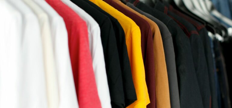 Verschiedene Kleidungsstücke hängen nebeneinander.