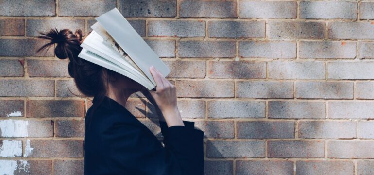 Eine Frau legt ein Buch gegen ihren Kopf.