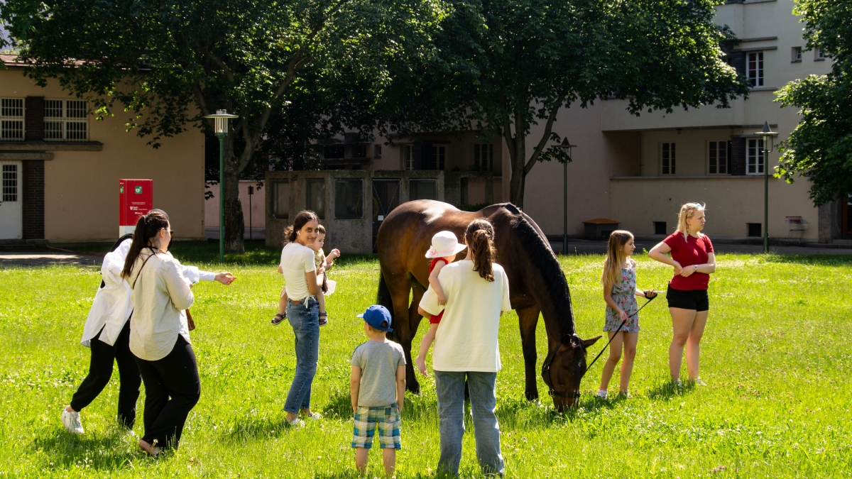 Und weil die sozialen Kontakte während der Coronavirus-Pandemie ohnehin gelitten haben, brachten die Student*innen Amanda Sperger und Robert Bettinger kurzerhand zwei Pferde in den Karl-Marx-Hof. Die ungewöhnlichen Besucher lockten zahlreiche Bewohner*innen des Gemeindebaus an: Die Therapiepferde „Avi“ und „Duke“ ließen sich geduldig streicheln – und Nachbar*innen kamen miteinander ins Gespräch.